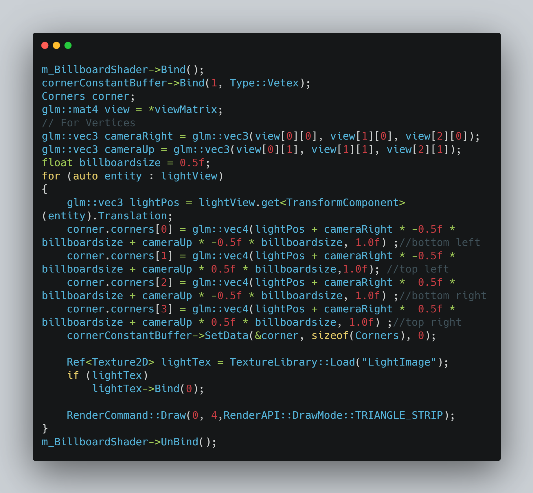빌보드 렌더링하는 코드입니다. 저는 여기서 정점버퍼와 인덱스버퍼를 구성하지 않고사용하는데요 사실 카메라의 위치에따라 계속해서 정점의 위치가 바뀌다보니 다이나믹 정점버퍼로 만들어서 프레임마다 계속 갱신해줘야합니다. 물론 큰 연산을 아니겠지만 그렇게 정점버퍼를 만들기는 귀찮더라구요 그래서 좀더 좋은방법을 생각했습니다.