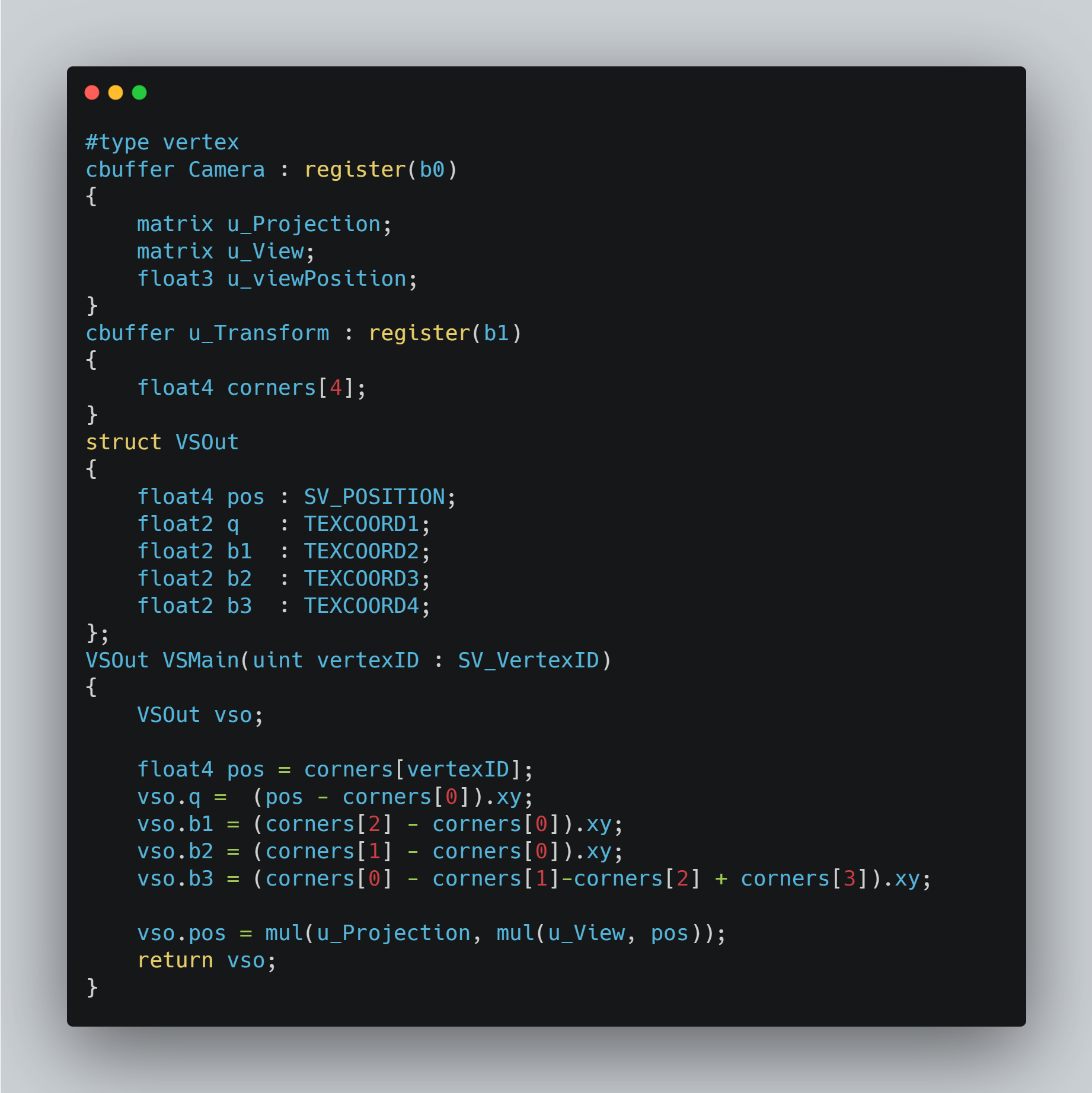 정점쉐이더에서 TopLeft 정점위치를 corners[1]에 넣어줬으므로 b2를 구성할때 corners[1] - corners[0] 로 구하는것에 유의하시고 계산하시면 직접 텍스쳐좌표를 정의하지 않고 계산식을통해 4개정점에대한 텍스쳐좌표를 이중보간을통해 얻을 수 있습니다.